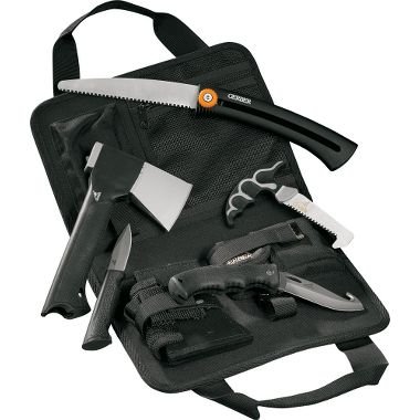 For years hunters have relied on Gerber tools and knives in the field, and this kit gives you the chance for substantial savings over buying these excellent items separately. You get a Gator Axe with a 7'' caping knife that stores in the handle, a Gator II folding knife with a gut hook for field dressing, an EZ saw and a sliding bone saw to prepare your game for a managable pack-out or storage. Everything comes in a ballistic nylon portfolio-style carry case, and each implement (except sliding bone saw) has its own sheath so it can be carried separately if needed. You'd spend over 0 to buy each of these items separately, which makes the kit at this price an exceptional value. Cabela's Exclusive. Made in USA.