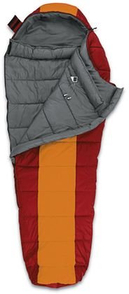 Rated to 0 degrees Fahrenheit, the Eureka WIld Basin mummy-style sleeping bag features a bag-within-a-bag design, which keeps cold air from the outside from getting through and warm air on the inside of the bag from escaping. The inner layer of the bag is cut smaller than the outer layer to create a consistent thickness of insulation throughout the bag, which prevent thermal leaks from forming. The trapezoidal foot section is angled to allow for the foot's natural sleeping position. It has a fully adjustable contoured hood. Other features include a two-way, self-repairing zipper, inside stash pocket, fleece pillow pocket, zipper thermometer and compression stuff sack.This sleeping bag is filled with Eureka's proprietary 7-hole slickened, polyester Thermashield fiber fill, which provides maximum insulation at the best value possible. Each Thermashield fiber strand contains 7 tunnel-like holes that run the length of the strand. Each of these holes traps air inside it's passageway creating dead air space that efficiently retains heat to keep you warm.